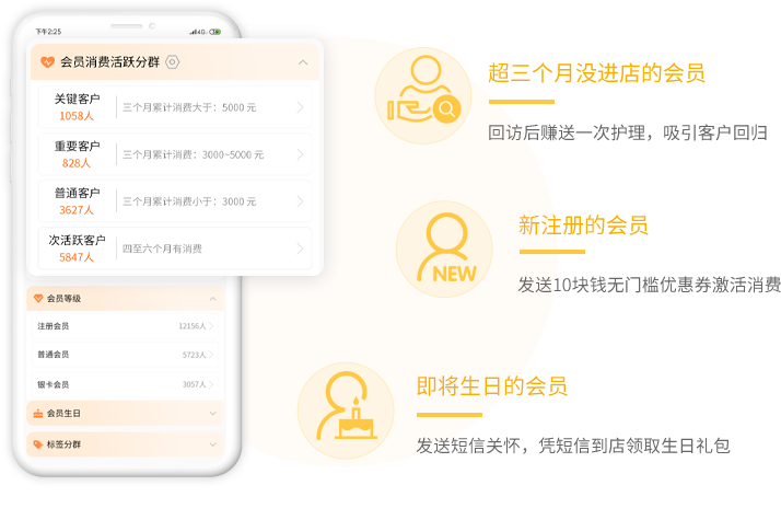 支付有礼、定向发券、每月礼包、生日有礼、评价有礼 充值送、小额储值、卡型升级、积分营销、积分签到…